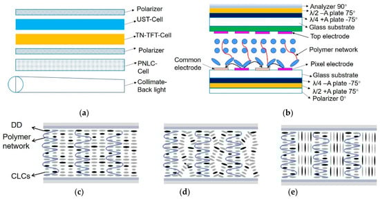 The structure of the viewing angle-tunable LCD is depicted in Figure 4a, it consists of two cells: an ultra-super twisted (UST) cell, which is situated between the upper polarizer and the TN-TFT cell, and a PNLC cell, which is situated between the lower polarizer and the backlight. When the electric field is absent, the PNLC cell acts as a negative retarder, causing viewing angle to be wider than a conventional TN-cell [35]. Polymer stabilized BP (PSBP) LCD becomes more and more attractive due to no alignment, the simple fabrication process and fast response time, a PSBP LCD with double-size IPS electrode structure is proposed, which shows transflective characteristics because the bottom electrodes are made by aluminum material. With the application of a bias voltage on the top electrodes, a good viewing angle controllable display is exhibited [36]. A viewing angle-controllable LCD utilizing PSBPLC and a single-panel method, without electric field, a BPLC appears to be optically isotropic, if there is a strong electric field, due to Kerr effect, the birefringence is induced along the electric field direction in the BPLC and increases with the electric field, viewing angle of the device can be controlled from 100° to 30° (Figure 4b) [37]. We have developed an electrically switchable viewing angle device that fabricated by DDs doped polymer stabilized cholesteric LCs (DD-PSCLCs) [38], with the additional photo-mask in the UV irradiation process, polymer has formed in the irradiated part, as shown in Figure 4c, when applying a relative lower electric field, CLCs in the irradiated part turn to be in focal conic state, while CLCs in the non-LC-irradiated part still keep planar state, as is described in Figure 4d, if the electric field is higher, CLCs in the irradiated part change to be homeotropic state, while CLCs in the irradiated part still be in the planar state (Figure 4e).