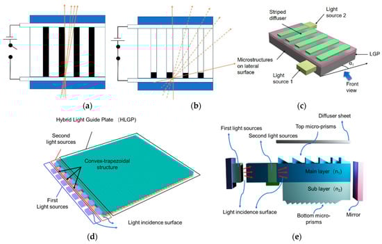 Setting an array of optical micro-rods, consisting of electrophoretic material that composed of black particles dispersed in a transparent medium, with a rectangular parallelepiped shape, whose size is 40 μm wide, 40 μm deep and 120 μm high, while the space between each optical micro-rod is 10 μm [8,39]. As the black particles are gathered electronically to one side in the transparent resin, the cross-stripe part filled by transparent substrate transmit incident light the same as the light-transmitting portions. A viewing angle switching device based on array of optical micro-rod is demonstrated (Figure 5a), as the black particles which enables switching two states between a WVA and a NVA in one second at 20 V of applied voltage (Figure 5b). Two modes are electrically switched, (a) NVA mode and (b) WVA mode. The limited viewing angle mode is +/− 30° of the visible angle and 50% of the transmittance, and the one for the non-limited viewing mode is 58% of the transmittance by the applied voltage of 20 V. A compact light guide plate (LGP) with special designed microstructures and dual light sources is proposed (Figure 5c), of which the micro-prisms are utilized to guide the emitting rays toward normal viewing cones while a set of strip-patterned diffuser toward wide viewing cones [40,41]. By simply switching the separate light sources, quick switching between the two modes is possible. If light source 1 is on, the backlight operates in the NVA mode, and if light source 2 is on, the backlight operates in the WVA mode [9]. Figure 5d represents the viewing angle switchable backlight module that is divided into three parts, the hybrid light guide plate (HLGP) is called the light incidence surface, the first light sources provide NVA mode and the second light sources provide WVA mode, Figure 5e depicts side view of the viewing angle controllable backlight module, the HLGP is composed of main layer and sub-layer with various refractive indices, the top micro-prisms are spaced with a graded interval for controlling the uniformity degree and the bottom micro-prisms reflect the rays to the main layer [9]. Consequently, in the NVA mode, the half-luminance angle decreases 11 degrees in the horizontal direction, while in the WVA mode, the half-luminance angle increases 56 degrees in the horizontal direction [9].