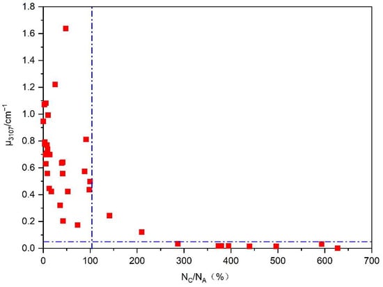 When the ratio of NC/NA is less than 1 (the left areas of the vertical dash line), the 3143 cm−1 absorption is more prominent. When the ratio of NC/NA is greater than 3, the 3143 cm−1 absorption coefficient is less than 0.05 cm−1 (below the horizontal dash line).