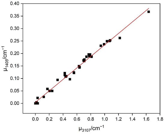 The 1405 cm−1 optical center has always been considered as the same structure as the 3107 cm−1 with a different vibration mode. The 3107 cm−1 defect has been assigned to a C–H stretch vibration, while the 1405 cm−1 has been assigned to a bend vibration [10]. Figure 3 shows that the absorption coefficient at 1405 cm−1 (μ1405) is plotted as a function of the absorption coefficient at 3107 cm−1. Through the automatic fitting method from the data analysis software of Origin, we found that the absorption coefficient at 3107 (μ3107) and 1405 cm−1 (μ1405) has a good linear relationship as μ1405 = 0.23 × μ3107. The absorption coefficient of 1405 cm−1 is only about a quarter of that of 3107 cm−1. Therefore, when the 3107 cm−1 peak is very weak, the 1405 cm−1 is almost invisible [10]. The ratio of normalized peak areas of the 3107 cm−1 and 1405 cm−1 peaks were also calculated (see Supplementary Materials, Figure S1). The average ratio of these values is 5.26, similar to the value of 5.21 mentioned in [7]. A correlation between 1405 and 3107 cm−1 was previously demonstrated in the early investigation of type Ia [7,20] and fancy white color and another type IaB natural diamonds [21]. The linear relationship between 3107 and 1405 cm−1 likely depends on the overall amount of aggregated nitrogen and hydrogen in those diamonds [21].