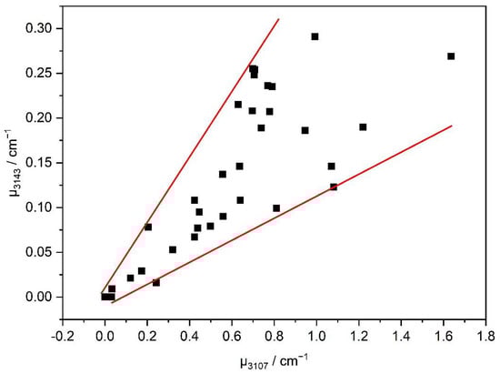 The relationship between 3107 cm−1 and 3143 cm−1 is shown in Figure 4 and Figure S2, from which we know there is no strict linear relationship between them. The absorption intensity of 3143 cm−1 is much weaker than that of 3107 cm−1. Generally, the stronger the absorption of 3107 cm−1, the stronger the absorption of 3143 cm−1. As can be seen in Figure 4 and Figure S2, there is no 3143 cm−1 defect when there is no 3107 or extremely weak 3107 cm−1. If the 3143 cm−1 absorption is present in the diamond, there must be a 3107 cm−1 absorption peak. The existence of a 3107 cm−1 absorption peak is necessary but not a sufficient condition for the emergence of a 3143 cm−1 absorption peak. In type Ia Cape diamonds, there is a pronounced 3107 cm−1 peak, but no 3143 cm−1 peak [7,20], which further supports the above statement.