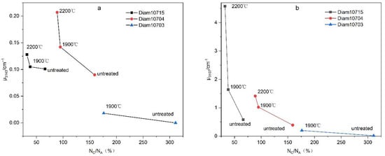 The nitrogen contents (NC is the isolated nitrogen content, NA is the A defect content) for the investigated diamonds were calculated using software caxbd97n, where the absorption coefficient at 3107 cm−1 (μ3107) against the NC/NA was plotted in Figure 2. It revealed that the 3107 cm−1 defect is strongly influenced by the value NC/NA. When NC/NA > 3, in other words, the isolated nitrogen is dominant in diamonds and the diamonds have almost no hydrogen-related absorption. Generally, no absorption related to hydrogen in the infrared region can be detected in a type Ib diamond [11,18]. When A center is dominant in diamonds and C center content is relatively small, that is when NC/NA < 1, the 3107 cm−1 absorption is apparent. The 3107 cm−1 defect is always created in the same temperature range as the N3 (three nitrogen atoms on a {111} plane, surrounding a common vacancy [1]) and B centers are formed following HPHT treatment of synthetic diamonds [8]. When the single nitrogen is dominant, the aggregate nitrogen is negligible, and no 3107 cm−1 defects are detected. The peak at 3107 cm−1 is more often found in diamonds or regions with relatively low single nitrogen content [19]. With nitrogen aggregation in diamonds, the A nitrogen content increases continuously. When the content of A nitrogen is relatively small, the 3107 cm−1 defect cannot be detected in diamonds. With the A nitrogen content gradually increasing, the absorption intensity of the 3107 cm−1 defect becomes stronger, implying that B nitrogen or N3 center may be generated in the aggregation process of C nitrogen to A nitrogen, although no B centers are detected in the IR spectra.