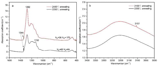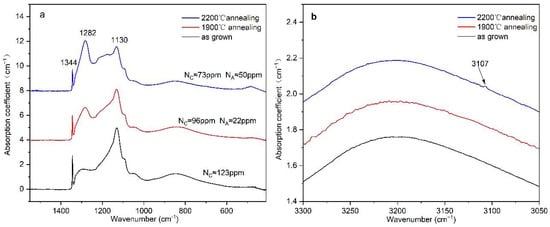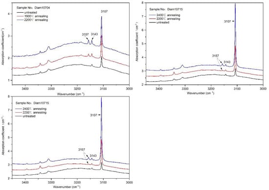 Figure 9 displays the other synthetic sample that experienced annealing at a temperature of 2200 and 2400 °C. When type Ib diamonds are heated at around 1500 °C, nitrogen impurities in synthetic diamonds diffuse to form close-by pairs called A centers [26]. The relative concentrations of A and C centers are different; the higher the annealing temperature, the more the concentration of the A nitrogen, and the less of the C nitrogen. With the A center content increase, the 3107 cm−1 absorption coefficient increases from 0.02 cm−1 to 0.04 cm−1 (Figure 9), and no other hydrogen-related absorption such as 3143 cm−1 is produced. Whether the 3143 cm−1 absorptions can occur in HPHT-treated synthetic diamonds requires further experimental investigation.