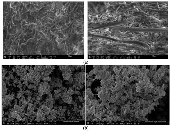 Figure 2 contains the SEM images of waste tea leaf, carbon material resulting from the pre-carbonization of waste tea leaf, biomass-derived-ACs material, and the Fe3O4-carbon-based composite. SEM images of waste tea leaf indicated its stem shape or tree root shape with rough surfaces. The pre-carbonizing of waste tea leaves at 600 °C destroyed its characteristic of the tree root morphology. The resulting carbon material had a rough surface with a coral reef-like shaped morphology. The biomass-derived-ACs material had a hierarchical porous structure, indicating that the KOH-induced chemical activation increased the porosity of the carbon precursor. The SEM images of the composite material showed that this material had a spongy-like texture with holes, covering the soft surface of adsorbent material.