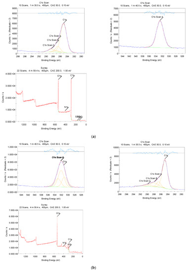 The surface analysis was performed on a Thermo Fisher Scientific XPS System (model K-Alpha) (Thermo Fisher Scientific, Waltham, MA, USA). The instrument was equipped with an 80° double-focusing hemispherical analyzer and a micro-focused, monochromated, low-power Al Kα X-ray source with variable spot size.