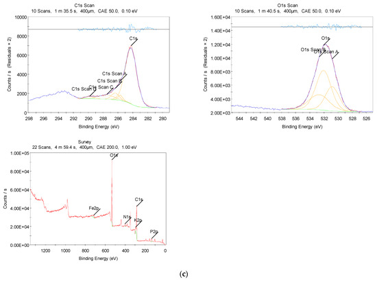 (a). XPS analyses of waste tea leaf: C 1s spectrum, O 1s spectrum, and survey spectrum. (b). XPS analyses of biomass-derived-ACs: C 1s spectrum, O 1s spectrum, and survey spectrum. (c). XPS analyses of Fe3O4-carbon-based composite material: C 1s spectrum, O 1s spectrum, and survey spectrum.