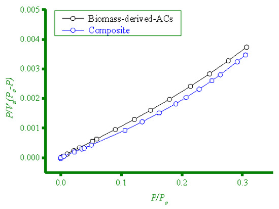 The BET surface areas of the biomass-derived-ACs and the composites were 630 and 784 m2/g, respectively (Table 3). The corresponding total pore volume of these samples was 0.2753, and 0.2939 cm3/g, respectively. These values indicate that Fe3O4 increased the surface area of the prepared material. According to the XPS analysis, the biomass-derived-ACs and the composite contain a large amount of oxygen (~47–52%), resulting from the KOH activation step. Oxygen groups prevent nitrogen from accessing the micropores for adsorption, thereby reducing the surface area and pore volume. These two materials have a low surface area and pore volume values.