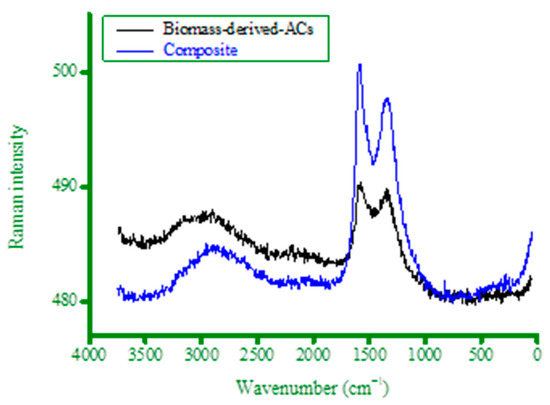 Figure 6 contains the Raman spectra of biomass-derived-ACs, and the composite material. The two samples possessed two distinct bands that belonged to the first-order spectral Raman lines (D and G bands). These two bands were centered at ~1585 cm−1 (indexed as G band) and at ~1354 cm−1 (indexed as D band). The D-band originates from the disordered carbons and represents the presence of structural defects. However, the G-band corresponds to the graphitized carbons and represents the stretching vibration of the sp2 (C–C) bonded carbon atoms. The intensity ratio of the D to G bands (ID/IG) estimates the graphitization of the sample [30]. A smaller ID/IG ratio reflects a higher degree of graphitization in the carbon material. However, a higher ID/IG ratio reflects more defects presented in the carbon material. The two samples exhibited a ratio of ~1.0. The broad bands appearing at ~2870–3050 cm−1 belonged to the second-order spectral Raman lines (2D band). Generally, the 2D band occurs in the 3250–2400 cm−1 region and is related to the disorder in the stacking of carbon layers.