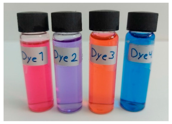 Aqueous solutions of the investigated dyes at (10 mg/100 mL), pH 7: Dye 1 (pink), Dye 2 (violet), Dye 3 (orange), and Dye 4 (deep blue).
