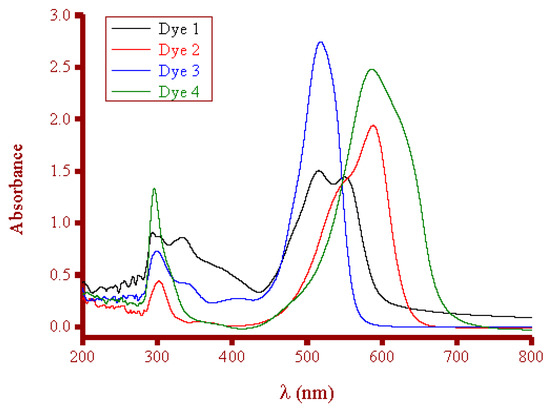 The electronic spectra of Dye 1, Dye 2, Dye 3, and Dye 4 in aqueous solution (10 mg/100 mL) at pH 7.