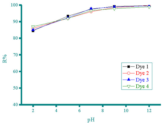 The effect of pH on the adsorption of Dye 1, Dye 2, Dye 3, and Dye 4 onto 0.1 g composite was investigated within the pH range of 2–12. An acid (HCl) and a base (NaOH) solution at a concentration of 0.01 N were used to adjust the pH of the dye solution to the desired value. The results showed that pH = 7 is the optimal value for the removal of the investigated dyes by the composite because after this value, the R% no longer increases (Figure 9). This is important economic point because at pH = 7, there is no need to consume more chemicals (acid or base) to adjust the optimum pH for dye removal, which represent an economic feasibility.