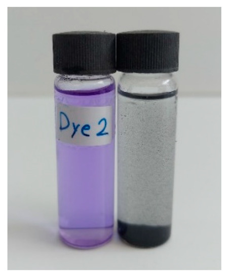 Photograph of Dye 2 solution before and after adsorption onto Fe3O4-carbon-based composite.