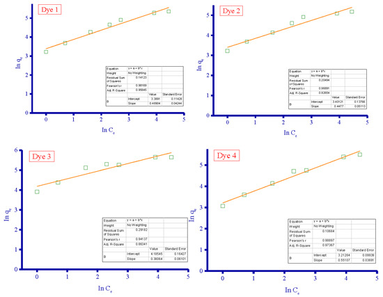 Freundlich isotherm plots for the investigated dyes (Dye 1–Dye 4).