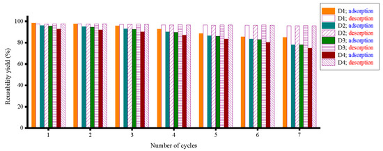Reusability yield (%) of seven repeated adsorption-desorption cycles.