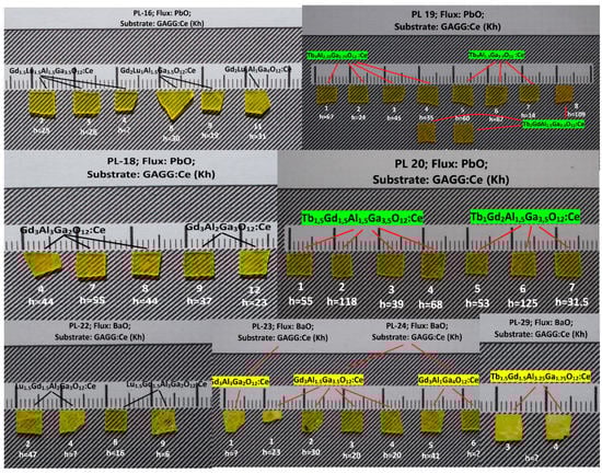 To get a high-quality multilayer scintillator, the misfit between lattice parameters of the single-crystalline substrate and film must not exceed 0.5–1% []. The single-crystalline films (SCF) were grown by the LPE method both from BaO and PbO fluxes, the basic features of which are described elsewhere [,,]. In total, over 40 samples of composite scintillators based on GAGG:Ce substrates and (Lu,Gd,Tb)3Al5−xGaxO12:Ce films with thicknesses within the 5–125 μm range were prepared (Figure 1). The nominal film compositions are presented in Table 1. The Ce concentration in the melt solution was 10 at% relative to the total concentration of the lanthanide cations.