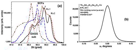 (a) XRD patterns of (Tb,Lu,Gd)3(Al,Ga)O12:Ce SCFs with different nominal contents (1—Tb3Al2.25Ga2.75O12:Ce SCF, 24 μm thickness, misfit Δa = −0.49%; 2—Lu1.5Gd1.5Al3Ga2O12:Ce SCF, 6 μm, Δa = −0.71%; 3—Tb2GdAl1.5Ga3.5O12:Ce SCF, 35 μm, Δa = −0.20%; 4—TbGd2Al1.5Ga3.5O12:Ce SCF; 125 μm, Δa = −0.54%); (b) X-ray rocking curve of Tb1.5Gd1.5Al1.5Ga3.5O12:Ce SCF, 6 μm.