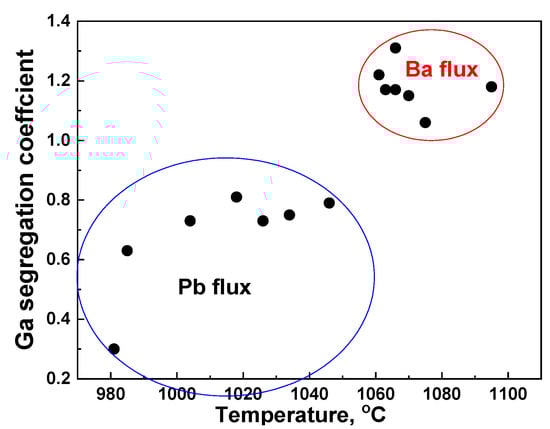 Regarding the segregation coefficients of Al/Ga occupying tetrahedral and octahedral positions, a large difference was observed between the samples grown from PbO and BaO fluxes (Figure 3). For the growth from PbO flux, the segregation coefficient of smaller Al atoms (1.50–1.81) was remarkably larger than that of larger Ga cations (0.62–0.78), which agrees well with results presented in [].