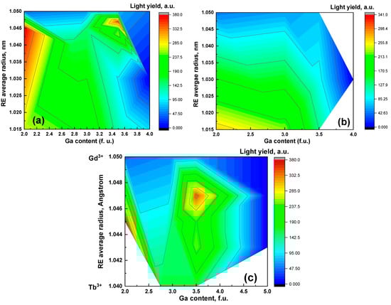 Light output in dependence on nominal cationic composition (Figure 4a) reflects the tendency to increase with reducing Ga content and average radius of a rare earth (RE) ion, namely by increasing Lu or Tb contents in the solid solutions. Meanwhile, another spot with high light yields was located at a Ga content of 3.5 formula units (f. u.) (Figure 4c). Considering the Gd-Lu (Figure 4b) and Gd-Tb (Figure 4c) mixed compositions separately, one may note that the tendency to light yield increase with reducing Ga and increasing Lu(Tb) content was sustained in both compositions. Meanwhile, a very high light yield of up to 380 % relative to YAG:Ce was observed in Gd-Tb mixed compositions at a Ga content around 3.5 f. u. Note that we presumed that the light yield in Al-free samples, i.e., at Ga content of 5 f. u., was equal to zero, as has been reported by different groups for Ce-doped Y3Ga5O12, Gd3Ga5O12, and Lu3Ga5O12 [,]. The data on light yield in GAGG:Ce films crystallized into GAGG substrates were taken from []. Overall, the region with the highest light yields extended from Lu-containing samples at x = 2–3 to Gd-Tb-substituted samples at x = 3.5–4 (Figure 4a).