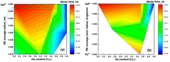 The scintillation decay times predictably decreased with Ga content (Figure 5), while there was a tendency to acceleration of scintillation decay with Lu and Tb addition. In general, the observed correlations were the result of the interplay between carrier trapping and energy transfer phenomena between Gd3+ and Tb3+ host cations and Ce3+ activator, as well as carrier trapping and thermal ionization of electrons from the 5d1 level of Ce3+ [,,,,]. Furthermore, cationic composition (represented as an averaged ionic radius of Lu, Gd, and Tb cations in dodecahedral sites, as well Ga content in octahedral and tetrahedral sites, affected the crystal’s field and location of carrier traps and Ce3+ levels in the bandgap.