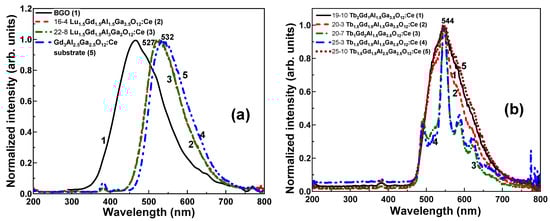 (a) Normalized XRL spectra of the selected Lu-Gd- (a) and Tb-Gd-based (b) composite scintillators in comparison with GAGG:Ce substrate and reference BGO scintillator.