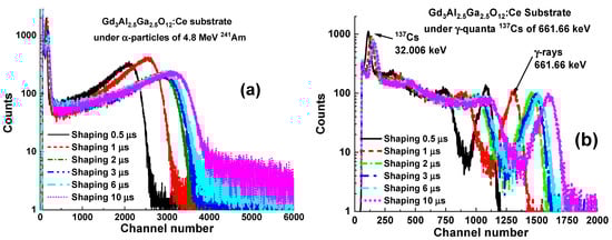 Pulse-height spectra of GAGG:Ce substrate under α-particle (a) and γ-quantum (b) excitation measured at different shaping times.