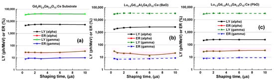 Dependences of LY and energy resolution (ER) of the GAGG:Ce substrates (a) and Gd1.5Lu1.5Al1.5Ga3.5O12:Ce/ GAGG:Ce composite scintillators grown from BaO- (b) and PbO-based (c) fluxes, respectively, as the function of shaping time measured under various γ-rays of 137Cs and α-particles of 4.8 MeV 241Am (CERN 241Am alpha source).