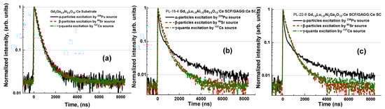 Scintillation decay of GAGG:Ce SC substrate (a) and Lu1.5Gd1.5Al1.5Ga3.5O12:Ce SCF/GAGG:Ce SC composite scintillators grown from PbO- (b) and BaO-based (c) fluxes under α- and β-particle and γ-ray excitations.