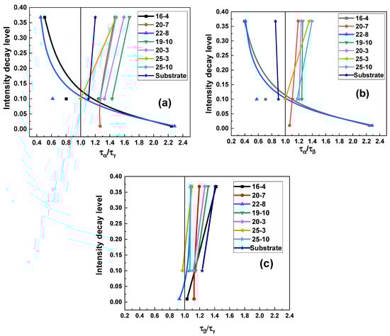 τα/τγ (a), τa/τβ (b), and τβ/τγ (c) ratios of the selected multicomponent composite scintillators under study (see Table 4 for the sample denotations).