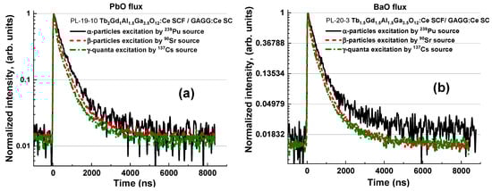 Scintillation decay of Tb2Gd1Al1.5Ga3.5O12:Ce SCF/GAGG:Ce SC (a) and Tb1.5Gd1.5Al1.5 Ga3.5O12:Ce SCF/GAGG:Ce SC (b) composite scintillators grown from PbO- (a) and BaO-based fluxes, respectively, under α- and β-particle and γ-ray excitations.