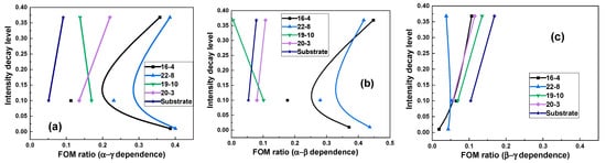 Figures of merit for the different pairs of irradiation types, FOMαγ (a), FOMaβ (b), and FOMβγ (c) of the selected composite scintillators under study.