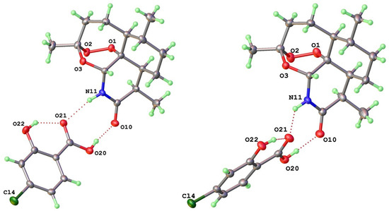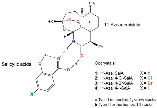 Salicylic acids, artemisinin and solvents used were of reagent grade supplied by Meryer Chemicals, (Shanghai). 11-Aza was prepared from artemisinin by low temperature reaction with ammonia, following the modified method of Haynes et al. [15] of the original synthesis by Ziffer [1]. All new cocrystal phases can be obtained from liquid assisted grinding (LAG) [16], using a Tencan XQM-0.4A mini-planetary ball mill with zirconia vessels and media. A minimal amount of methanol (η factor = 0.2 mL/g) was used to accelerate the solid-state transformations which took between 30 min to 2 h [4]. Single crystals were grown by controlled evaporation at room temperature from methanolic solutions saturated with 11-Aza and containing slight excess of the salicylic acid. Specimen size for all the bromo and iodo containing compounds was kept small (<0.2 mm dimension) for single crystal X-ray diffraction to minimize absorption effects.