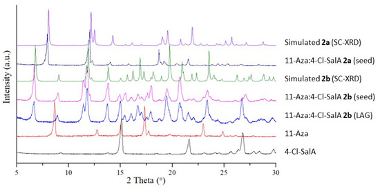 Powder X-ray diffractograms for 2a (from solution growth after hetero-seeding with 1) and 2b from LAG along with the coformers 11-Aza and 4-Cl-SalA.