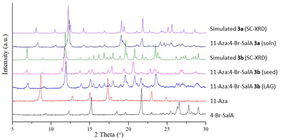 Powder X-ray diffractograms for 3a (from solution growth) and 3b from LAG along with the coformers 11-Aza and 4-Br-SalA.