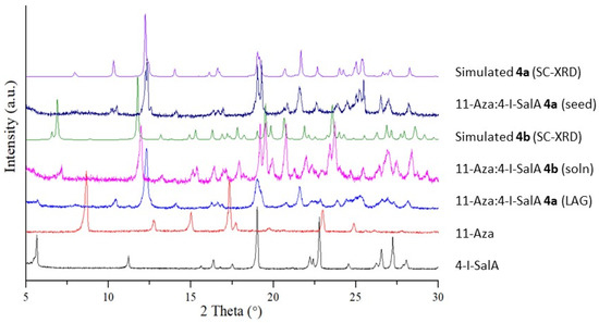 Powder X-ray diffractograms for 4a (from solution growth after hetero-seeding with 1) and 4b from LAG along with the coformers 11-Aza and 4-I-SalA.