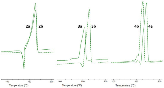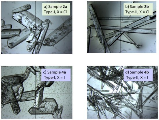 Apart from the powder X-ray diffraction patterns the crystal habits of the larger solution grown single crystals are reasonably distinct. Type-I crystals display a tabular bar-shaped morphology, whereas for type-II the aspect ratio is much larger and the crystals are best described as needles. Representative optical micrographs of the two types for X = Cl and X = I are shown in Figure 5. Thermal analysis of 2–4a were compared to 2–4b. The results in Figure 6 typically showed a small endothermic peak indicating melting, before a larger exothermic peak due to decomposition of 11-azaartemisinin between 150–160 °C. Slight higher thermal offsets support the idea that 2b, 3b and 4a are the thermodynamically more stable phases.