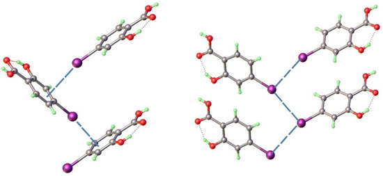 One interesting consequence of the interactions between the stacks in the two polymorphs is the close interactions made by the halogens. As shown in Figure 10 the 4-halo-salicylic acids can self-associate as depicted for the 4-I case. In the type-I polymorph this interaction is primarily via a halo-phenyl close contact of a sigma hole-pi nature. The closest I---C non-bonded distance is around 3.54 Å, but orthogonal displacement of the I atom to the plane of the neighboring phenyl ring is just 3.496 Å. This has been depicted by the dashed line in the left hand side of Figure 10. In type-II cocrystals the twist of the salicylic acid molecules now places them in a zig-zag arrangement with respect to each other with short X---X contact. This halogen bond [28] is clearly bona fide in 4b with I---I of 3.871 Å.