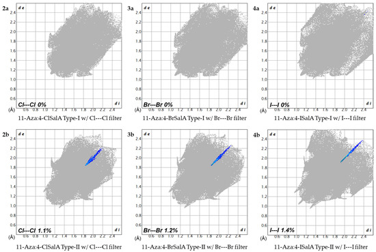 In the type-I phases the shortest halogen—halogen distances are clearly non-bonding and approximately 0.9 Å longer than those found in type-II as indicated by the X---X entries in Table 3. The halogen-halogen and other interactions between the molecular pair surfaces with neighbors is usefully probed by Hirschfeld surface analysis fingerprint plots, shown in Figure 11, with the analysis conveniently carried out by Crystal Explorer [29]. The type-II cocrystals all show X---X component (highlighted in blue in Figure 11) whereas the type-I do not.