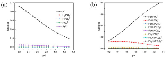 Distribution of the various complexation species under different pH environments: (a) shows distribution of H+, H2PO4−, HPO42−, PO43− and Fe3+; (b) shows distribution of the rest of the ions.