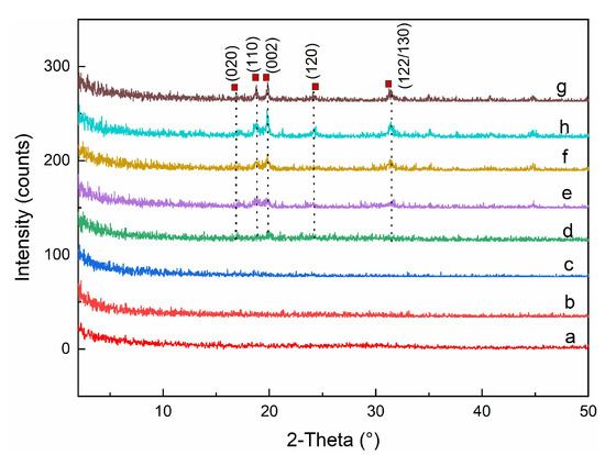 The Powder X-ray diffraction pattern of samples taken at 0 min (a), 180 min (b), 205 min (c), 225 min (d); 235 min (e), 245 min (f); 255 min (h), 450 min (g), respectively.