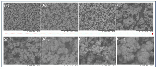 SEM images of morphology evolvement of FePO4·2H2O during the experiment: (a) 0 min; (b) 30 min; (c) 150 min; (d) 450 min; (a’–d’) are images with the higher magnification at the corresponding times (0 min, 30 min, 150 min, 450 min).