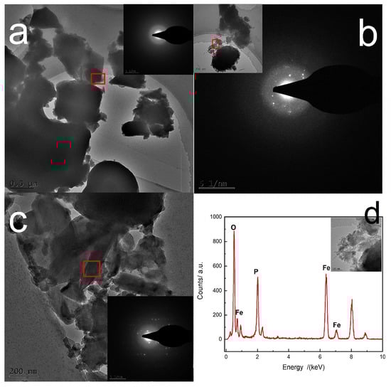The morphology during the reaction was studied by SEM and TEM as shown in Figure 5 and Figure 6. At the initial stage of the reaction, the sample mainly exists in the form of amorphous microsheet agglomeration and the average size is about 2 μm to 4 μm, as shown in Figure 5a and Figure 6a. The size of microsheets gradually decreased and the extent of agglomeration increased slightly. They grew and agglomerated together by continuous dissolution–recrystallization. Figure 5c shows that plentiful nanoparticles formed on the surface of agglomerates at 150 min, which were found to be a mixture of mostly amorphous and little crystalline FePO4·2H2O by selected area electron diffraction (SAED)—which shows an inconspicuous diffraction pattern, as shown in Figure 6b. But there is still no obvious diffraction peak of powder X-ray diffraction pattern at this time, at which the content of crystalline FePO4·2H2O is lower than the minimum content standard of powder X-ray diffraction analysis. The monoclinic FePO4·2H2O nuclei on the active surface of amorphous agglomerates gradually grew and agglomerated accompanying the dissolution of amorphous FePO4·2H2O into ions. Ultimately, dense spheroid-like monoclinic FePO4·2H2O particles were produced continuously by dissolution–recrystallization of agglomerates. It was proven that the spheroid-like particles are comprised of long flakes of monoclinic FePO4·2H2O as illustrated in Figure 6c.