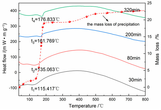 Heat-flow and mass change of precipitation at different reaction time during heating.