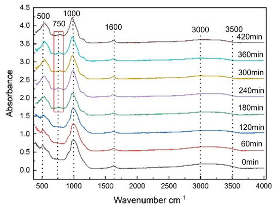 After 180 min, a new peak at 750 cm−1 appeared, corresponding to the P-O vibration caused by the coupling effect between PO43− polyanion and Fe-O within the structure [32,33,34,35]. The symmetrical vibration characteristic peaks of PO43− anions at 997 cm−1 disappeared, and asymmetrical vibration peak at 1165 cm−1 appeared over time, as shown in Figure 8. These changes indicate that the FePO4·2H2O orderly rearranged and monoclinic FePO4·2H2O formed.