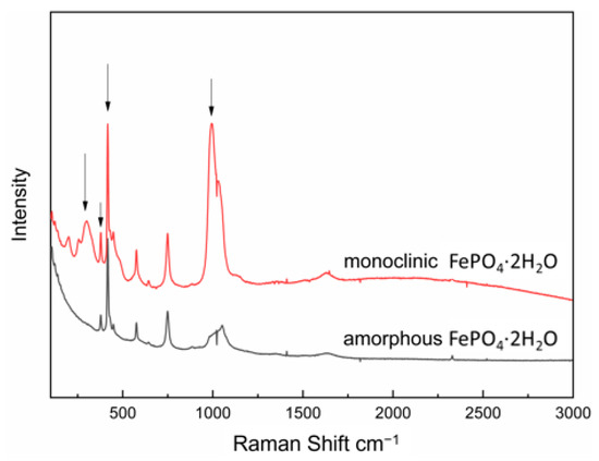Raman was used to monitor the transformation of amorphous FePO4·2H2O, as shown in Figure 10. Transformation of amorphous FePO4·2H2O was followed by the appearance of monoclinic FePO4·2H2O characteristic peaks and the changes in height of the characteristic peaks: a new peak at 303 cm−1 appeared in the Raman spectra and its intensity increased gradually as the monoclinic FePO4·2H2O content increased during transformation.