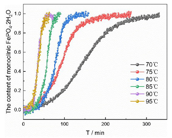 The percentage content of monoclinic FePO4·2H2O vs. time at different temperatures.
