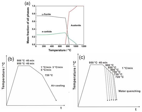 Finally, the microstructure evolution diagram during DET is summarized in Figure 9. After austenitizing, the ferrite–austenite transformation occurs completely, and the microstructure is composed of some κ-carbide particles retained in the austenite matrix. When the temperature decreases to about 900 °C, the κ-pearlite and ferrite transformations combined with the growth of κ-carbides commence. With decreasing quenching temperature to 850 °C, the austenite–ferrite transformation is finished, and just the morphology evolution of κ-carbides takes place during the subsequent slow cooling process. There are two types of κ-carbide, namely intergranular κ-carbides and intragranular κ-carbides. The latter are thin particles distributed in ferrite matrix, while those short rod-like carbides are regarded as the production of pearlite spheroidization. When the temperature decreases to about 800 °C, the disappearance of intergranular carbides is due to the spheroidization in the cooling process and the growth of ferrite grains. During this process, κ-carbides are just spheroidized and grow up. As the temperature continues to decrease, the κ-carbides grow up obviously both near grain boundaries and inside grains. However, the spheroidization effect is not ideal as the temperature decreases to about 720 °C due to the existence of strip κ-carbides near grain boundaries. During the subsequent air-cooling process, the strip κ-carbides might be further spheroidized, and the κ-carbides are dispersedly distributed in the ferrite matrix. In addition, the austenitizing temperature mainly influences the fraction of undissolved κ-carbides, and the lower cooling rate is beneficial for a good spheroidization effect.