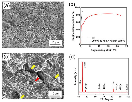 (a) SEM image of the microstructure in HSYM-HR; (b) engineering stress–strain curves of HSYM-HR and HSYM-DET; (c) SEM image of the fracture surface morphology of HSYM-HR; (d) XRD pattern of HSYM-HR.