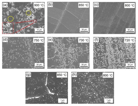 SEM micrographs showing the microstructures in the samples subjected to staged quenching from 900 °C (a), 850 °C (b), 800 °C (c), 750 °C (d), 730 °C (e) and 720 °C (f), and the relevant high-resolution observations of the samples subjected to staged quenching from 850 °C (g) and 800 °C (h).