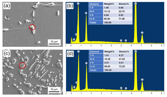 SEM images (a,c) of the carbides and the relevant EPMA analyses (b,d) of their chemical compositions in the samples quenched in stages to 750 °C, (a,b) intergranular carbides, (c,d) intragranular carbides.