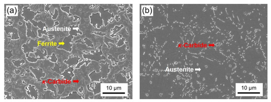 Then, the mechanism for the influences of austenitizing temperature and slow cooling rate on the evolution of κ-carbides was explored. According to the thermodynamic phase diagram in Figure 1a, two austenitizing temperatures were selected for obtaining a fully austenitizing condition and a partially austenitizing condition. The designed heat treatment process is shown in Figure 1b, and SEM images of the microstructures in the HSYM steels at different austenitizing temperatures are presented in Figure 6. Part ferrite, κ-carbides and austenite exist in the 900 °C-40 min (HSYM-900) sample (Figure 6a). Only a few κ-carbides and austenite exist in the 950 °C-40 min (HSYM-950) sample (Figure 6b). The ferrite in HSYM-900 has an irregular morphology, and the fraction of κ-carbides is significantly higher than that in HSYM-950.